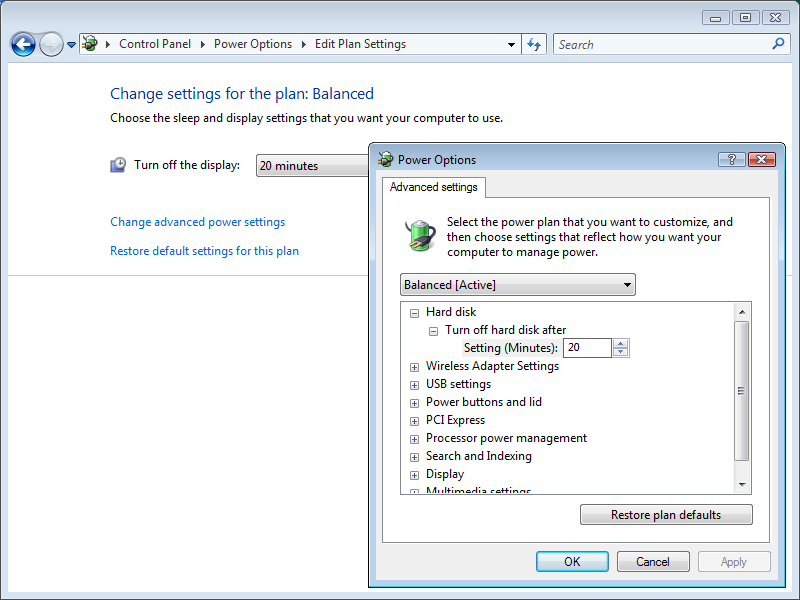 As you can see, both operating systems set your hard disks to turn off after only 20 minutes of inactivity. That’s unacceptable. Unless you’re marketing the operating system as a “green,” OS (and they are), there’s no need for such draconian power down settings as Grimblast mentions below.